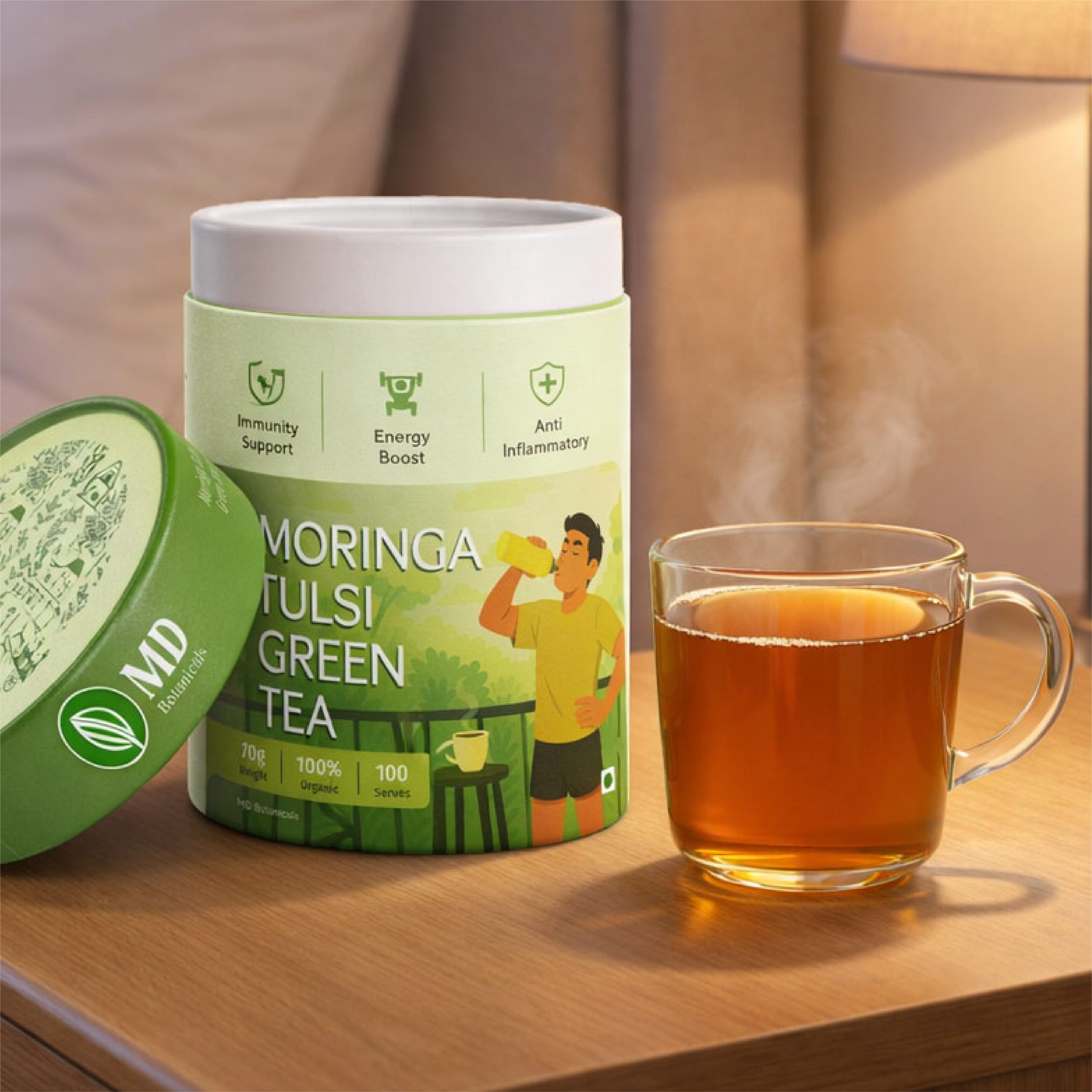 Our Moringa Tulsi Herbal Brew is a herbal tea made without Camellia sinensis, making it naturally caffeine free. It supports immunity, boosts natural energy, and promotes anti inflammatory balance. A nutrient rich Ayurvedic infusion for daily vitality.