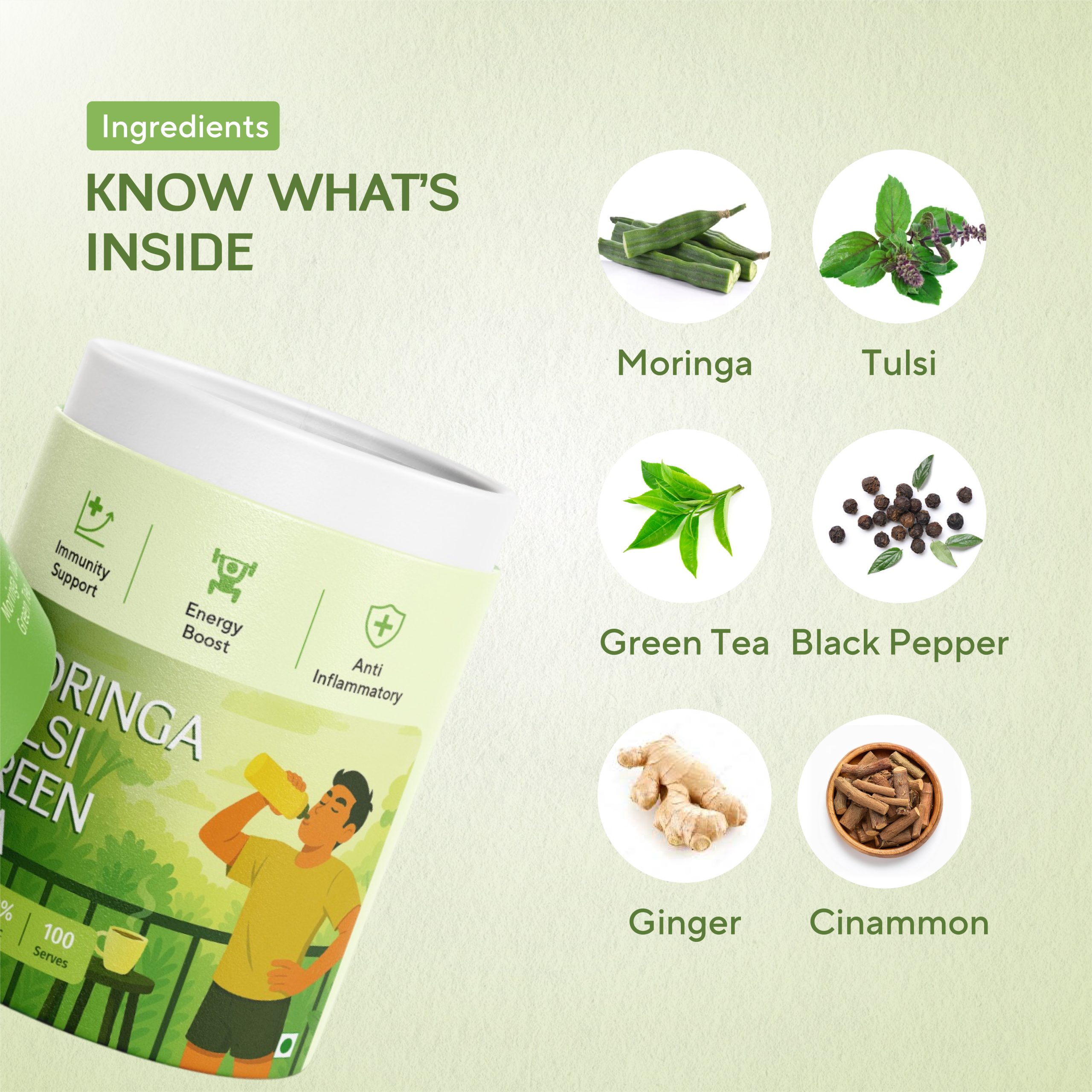 Moringa, Tulsi, Black Pepper, Green Tea, Ginger, Lemongrass