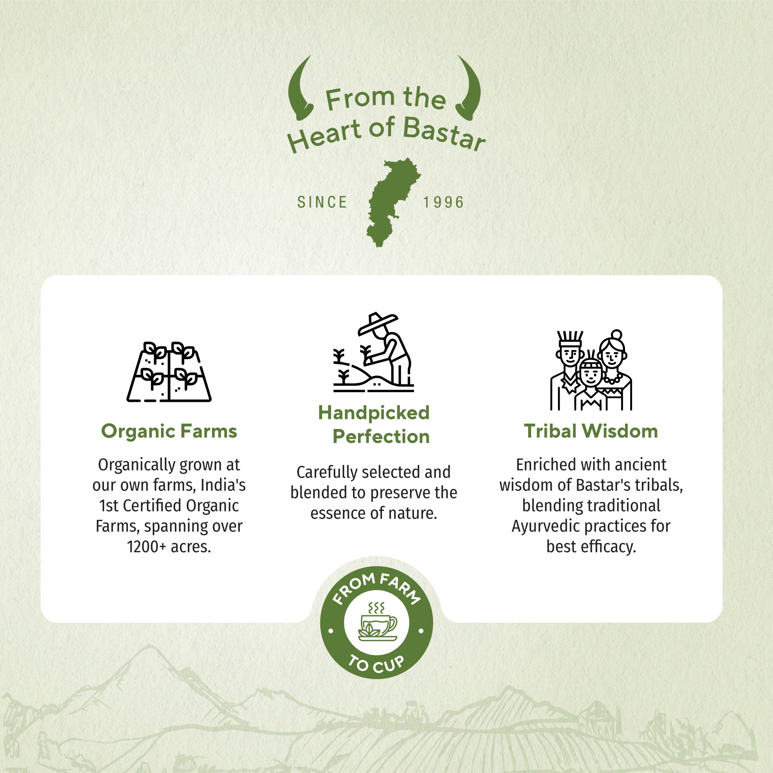 For over 30 years, Maa Danteshwari Botanicals has grown alongside the tribal communities of Bastar, preserving traditional Ayurvedic farming practices. Recognized as India’s 1st Certified Organic Farms since 1996, our journey is built on soil, sustainability, and shared wisdom. Every cup carries the strength of land, people, and tradition.