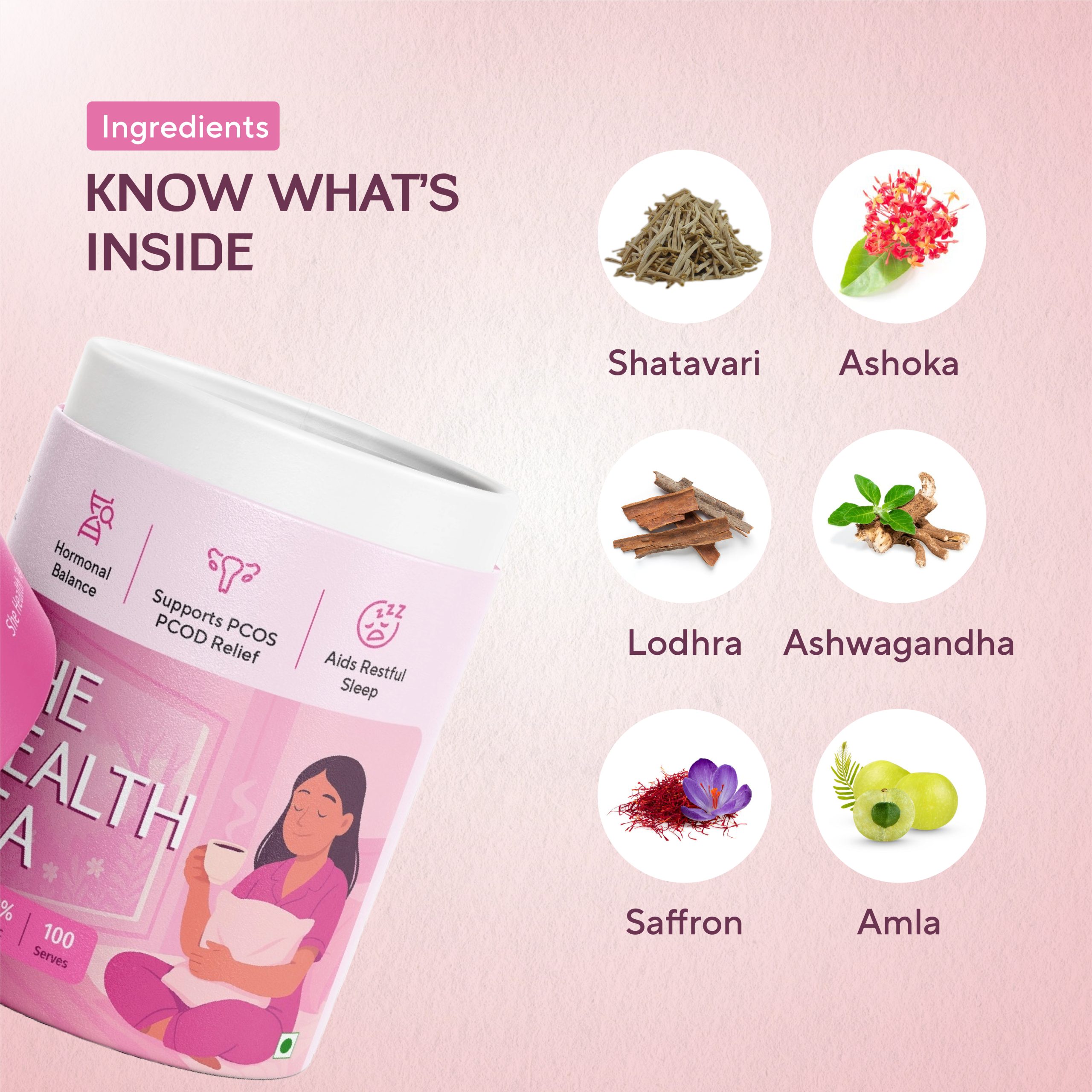 Shatavari, Lodhra, Saffron, Green Tea Leaves, Ashoka, Amla, Moringa, Cardamom, Black Pepper, Guava Leaves, Cinnamon, Ashwagandha