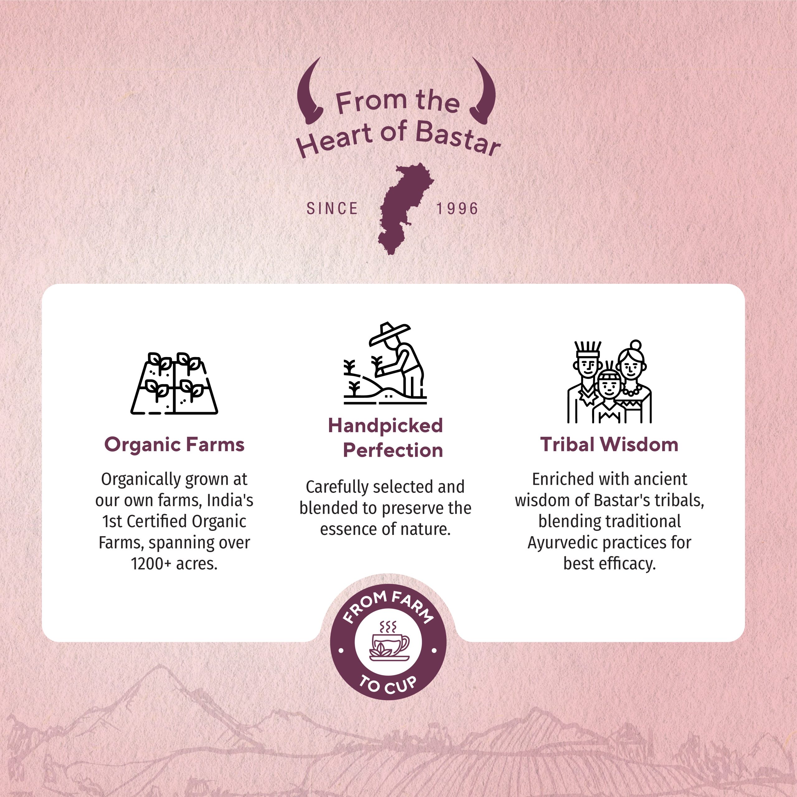 For over 30 years, Maa Danteshwari Botanicals has grown alongside the tribal communities of Bastar, preserving traditional Ayurvedic farming practices. Recognized as India’s 1st Certified Organic Farms since 1996, our journey is built on soil, sustainability, and shared wisdom. Every cup carries the strength of land, people, and tradition.